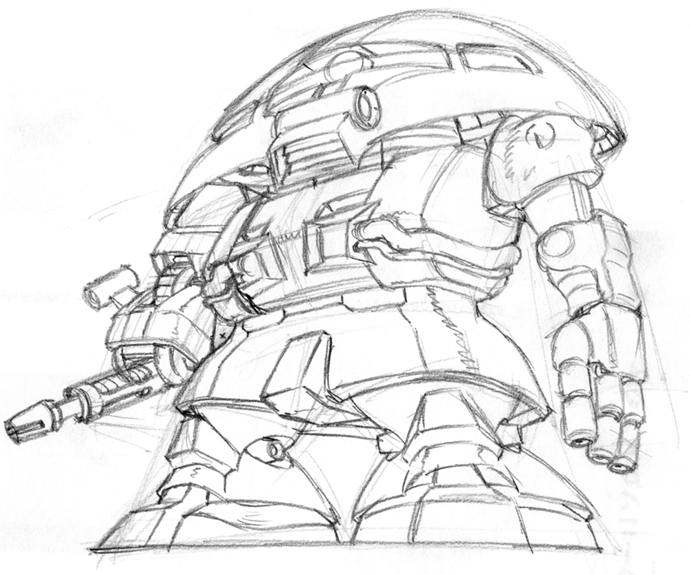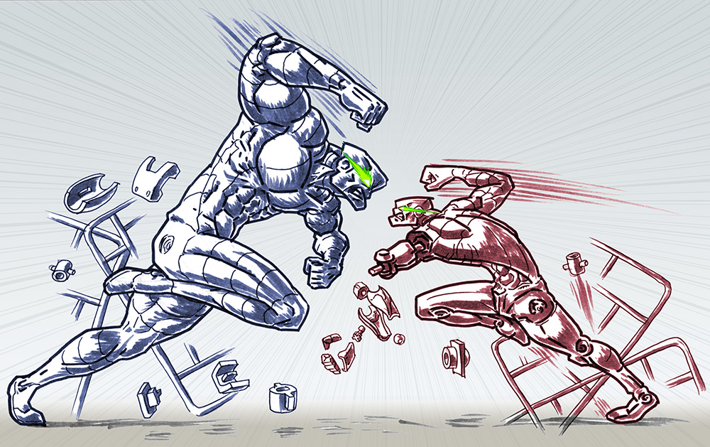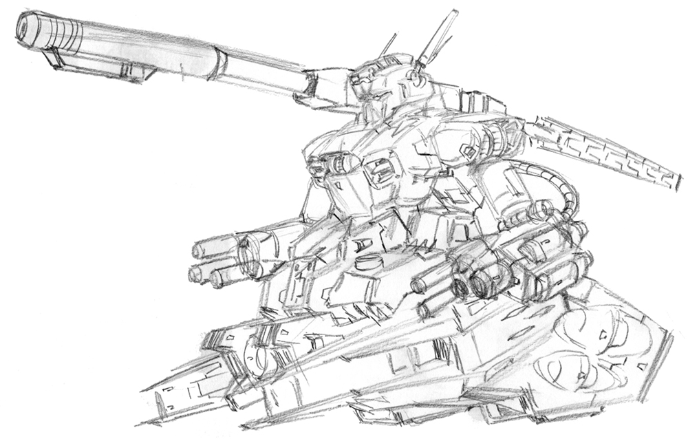 「プラモのロボが、バーッと組み上がりながら激突する」っていうイラストを妄想したんだけど、ラフを描いてみたら、かなりめんどくさいので、ナシ。