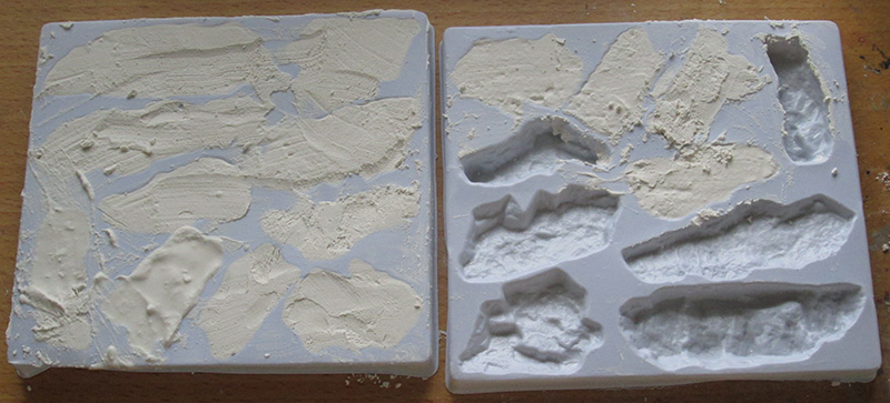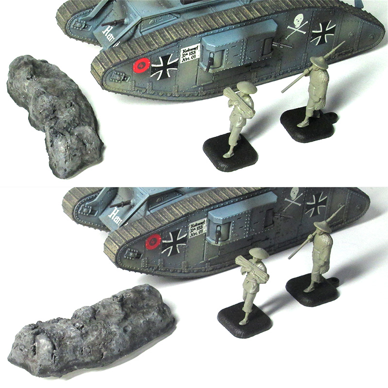 1:石膏の岩を1個塗ってみました。アクリジョン、筆で。1/72のものと並べて雰囲気を。